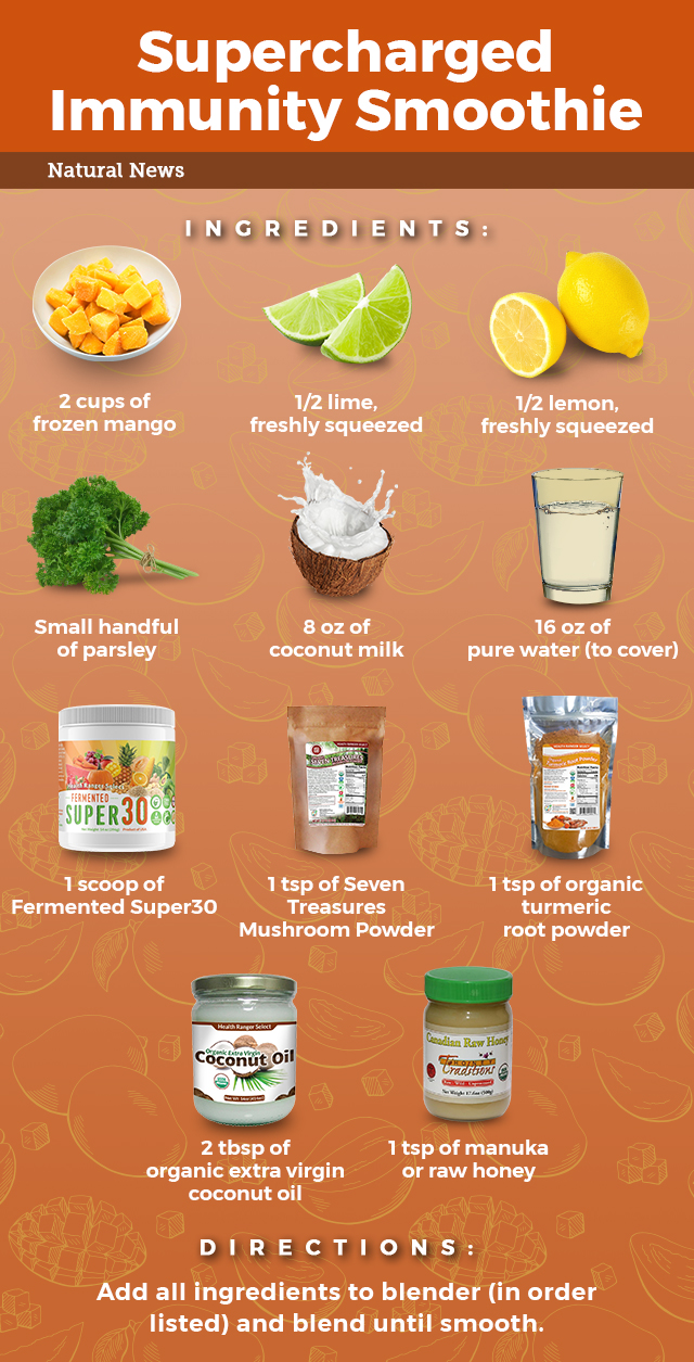 These ingredients were put together this way to create a very synergistic blend of nutrients to support immunity, and to create a delicious tropical-tasting smoothie. The two most powerful ingredients in this smoothie for immunity are the Health Ranger’s Fermented Super30 and Seven Treasures Mushroom Powder.